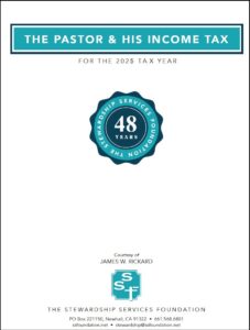 The Stewardship Services Foundation prepares a booklet entitled The Pastor and His Income Tax. Each booklet is designed for a specific tax year. Our booklet for the current tax year will be available in January. You can download the Booklet here: 2025 Booklet – The Pastor and His Income Tax